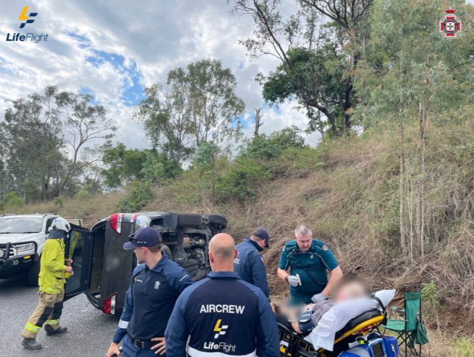 A Bundaberg-based LifeFlight crew airlifted a man in his 70s to hospital after a two-vehicle crash near Gladstone.a