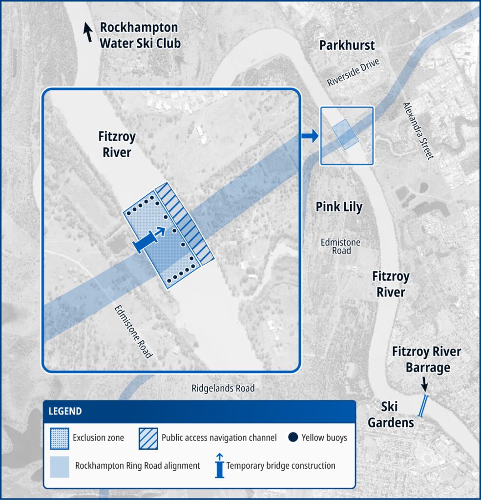 “We understand the temporary exclusion zone in the Fitzroy River, between Pink Lily and Parkhurst may cause some inconvenience for river users, but safety is a top priority for the public, the joint venture contractor and the Queensland Government.”